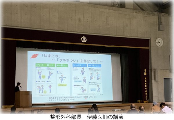 第一部の整形外科部長伊藤医師の講演では、「いつまでも健康で楽しい生活を送るために」という内容で、平均寿命と健康寿命の比較など興味深いお話をしていただきました。