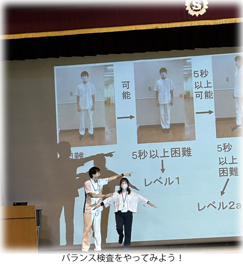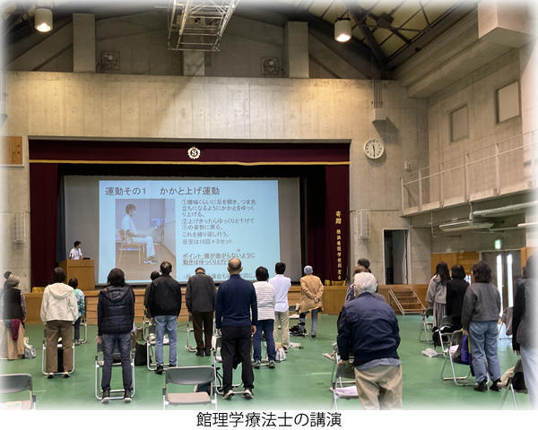 第二部の館理学療法士の講演では「転ばないための健康体操」をテーマにクイズをしたり、みんなで一緒に簡単な体操を行いました。
