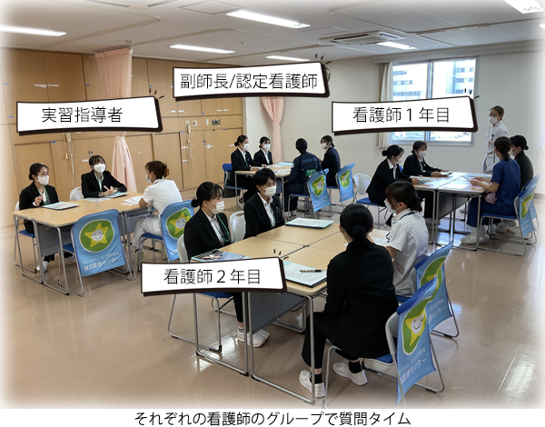 その後、グループに分かれて看護師としての知識や心得についてはもちろん、気になる通勤方法や夜勤制度、人気の病棟は?寮はきれい?など素朴な疑問にも先輩看護師にたっぷり教えてもらい説明会を終了しました。