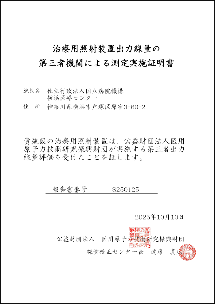 第三者機関によって当院の放射線治療装置で用いられているX線の出力線量の精度が十分保証されていることを表します。