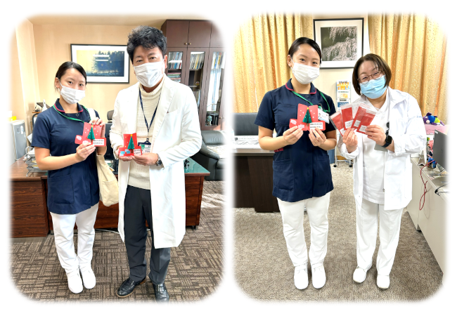横浜医療センターでは、全学年の学生がグループに分かれ、患者さんのもとに直接伺ってクリスマスカードをお渡ししました。