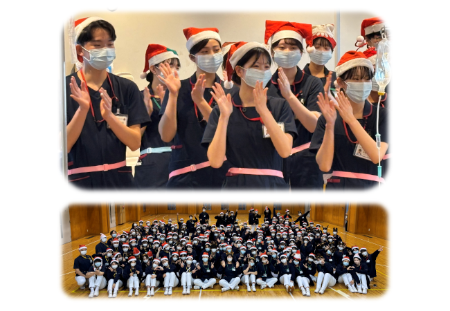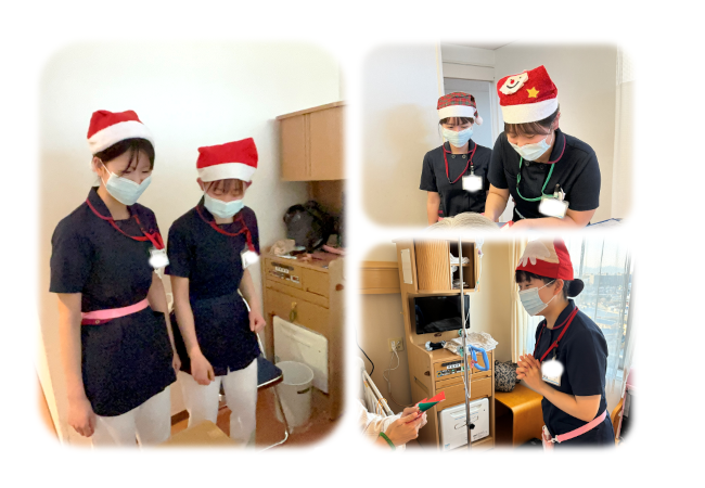 また、各階のデイルームでは、「あわてんぼうのサンタクロース」「サンタが街にやってくる」の2曲のクリスマスソングを行い、患者さんにお届けしました。