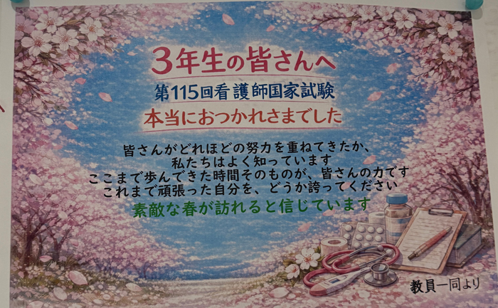 看護師国家試験にあたり、講師の先生方をはじめ、実習施設の皆さまから、多くの方から温かいご支援と指導をいただき、ありがとうございました!!